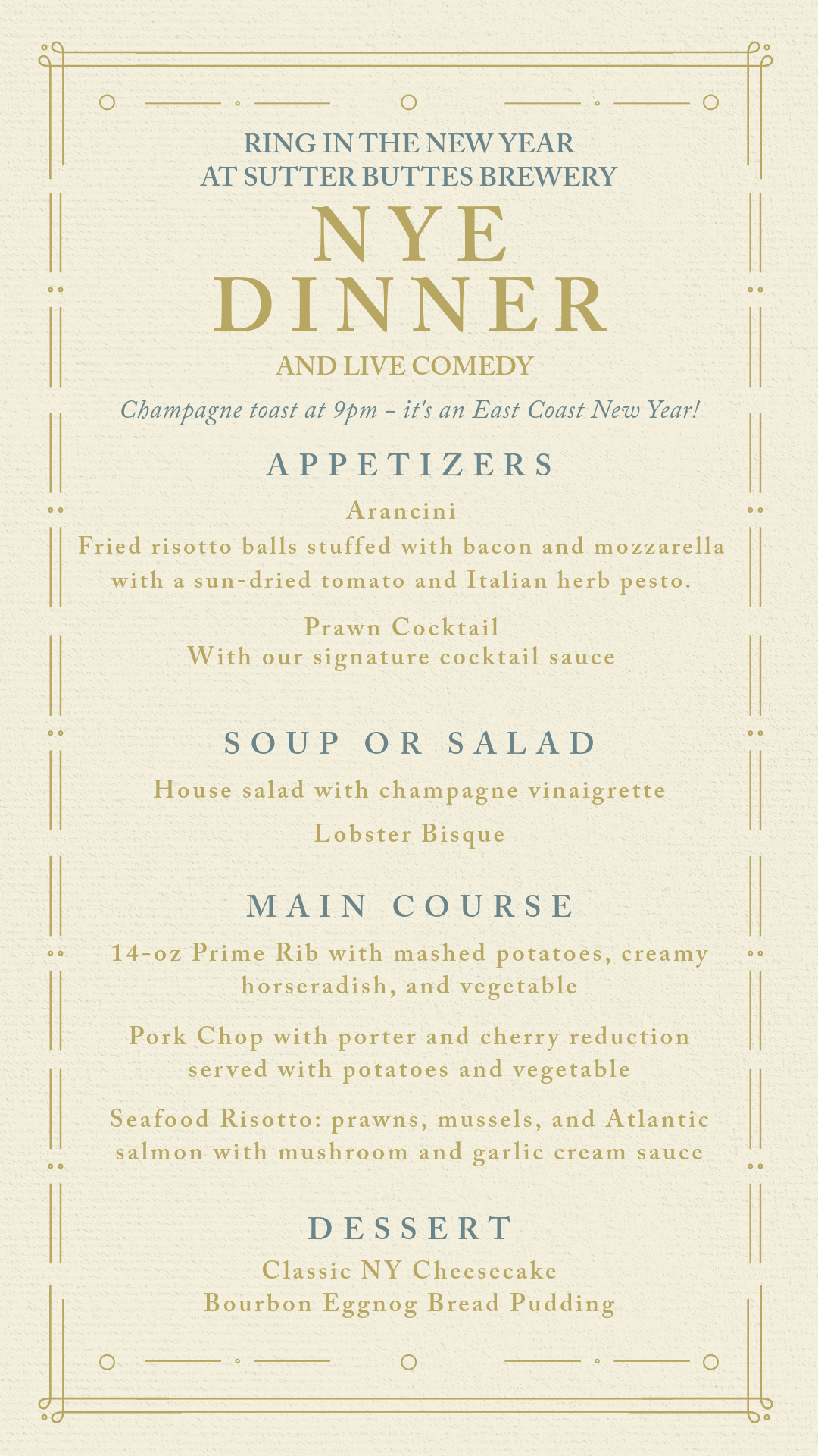 Tickets include show admission, four-course meal, and champagne toast (at 9pm). Purchase a reserved table-for-four and select a bottle to enjoy with dinner: Rye Side of the Moon (Imperial Stout), local red or white wine, or champagne.